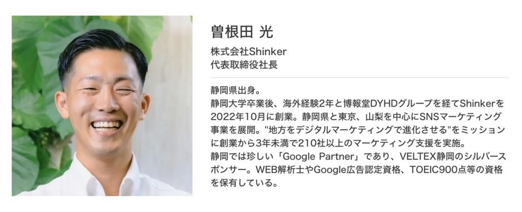 ご登壇いただくのは、静岡を拠点にWeb広告・SNS運用・SEO対策などを手がけ、業界業種問わず数々の地方企業の集客・認知向上を支援してきた株式会社Shinkerの代表取締役 曽根田 光さん。