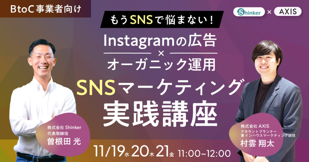 このたび、株式会社アクシス様とShinkerの共催セミナーとして、BtoC事業者様向けのSNSマーケティング実践講座を開催いたします!